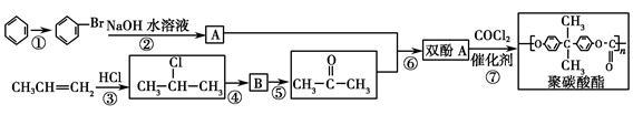 Ⅰ.ADⅡ.(1) ① ② ④ (2) (3)2­氯丙烷 (4)3 (5)H 2 O (6) +O 2 +H 2 O Ⅰ.选项A,根据相关信息,在较高温度下聚碳酸酯易释放出双酚A,用聚碳酸酯制成的茶杯泡茶时一些双酚A会溶解在H 2 O中,饮用这种茶水对人体有害。选项B,根据双酚A的结构简式及梨肿崇C、H、O原子的成键规则,可知其分子式为C 15 H 16 O 2 。选项C,根据双酚A的结构简式,该有机物分子中含有4种不同化学环境的H原子( ),故其核磁共振氢谱显示有4组峰,且峰面积之比为1∶2∶2∶3。选项D,1 mol双酚A与Br 2 发生取代反应时可以消耗4 mol Br 2 。Ⅱ.(1)反应 ① ②瓦狗 ④为取代反应,反应 ③为加战呈成反应,反应 ⑤为氧化反应。(2) 在NaOH水溶液中发生水解反应得到 。(3) 属于卤代烃,按系统命名法,其名称为2­氯丙烷。(4)CH 3 CH=CH 2 与Cl 2 的加成产物为 ,其同分异构体有如下3种: 、 (5)由题中所给的信息可知双酚A的结构简式为 ,2分子 与1分子 反应得到双酚A(C 15 H 16 O 2 ),根据原子守恒可知另一产物为H 2 O。(6)由题意知有机物B为 , 发生催化氧化得到 。 与 在催化剂作用下发生缩聚反应得到 。