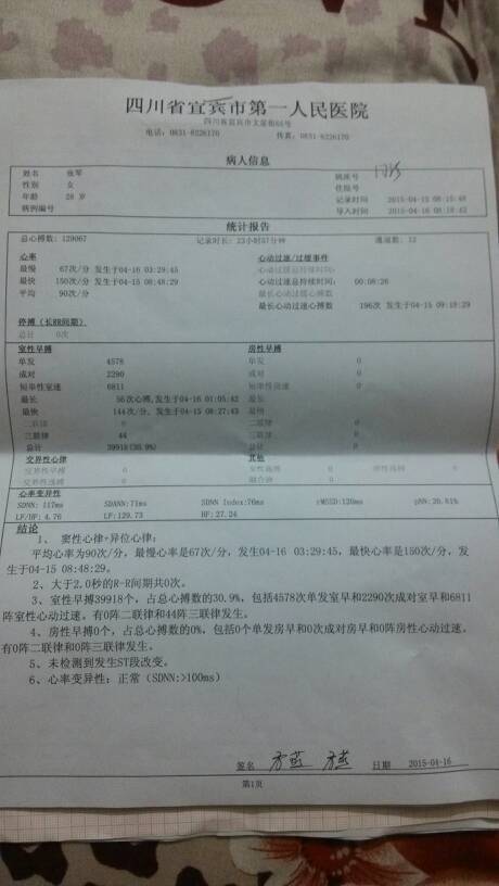孕14周,查心电图窦性心率,频发室性早搏,阵室性心动过速,做了心脏彩超和心肌酶检查正常,这是24小