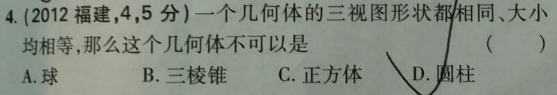 数学题这道题会做,但好奇怪高考题难道出错了,原题是这样吗书印错了,只解释一下B项 点击展开 匿名用户 2013-11-19 15:06 满意回答 B可以的,例:他的三视图都是等腰直角三角形 匿名用户 2013-11-19 15:23 宝宝知道提示您:回答为网友贡献,仅供参考。 为您推荐: 其他回答 就选D不用质疑,亲记的点赞哦 匿名用户 2013-11-20 16:15 应该是多选题吧,B和D都不可以。 匿名用户 2013-11-19 15:27 不管怎么看,三椎体都是三角形啊。 匿名用户 2013-11-19 15:24 没问题的,人间说的是 不可以的是 三棱锥三视图都是三角形 匿名用户 2013-11-19 15:14 加载更多 相关问题 求大神帮看下第十题有没有对,感觉好奇怪ps数学题 找一本国外数学书,作者的孙女从小不爱数学,作者通过做游戏的·方式,小孩根本不知道在做数学题 一道数学题,不懂,好奇怪(相似三角形)