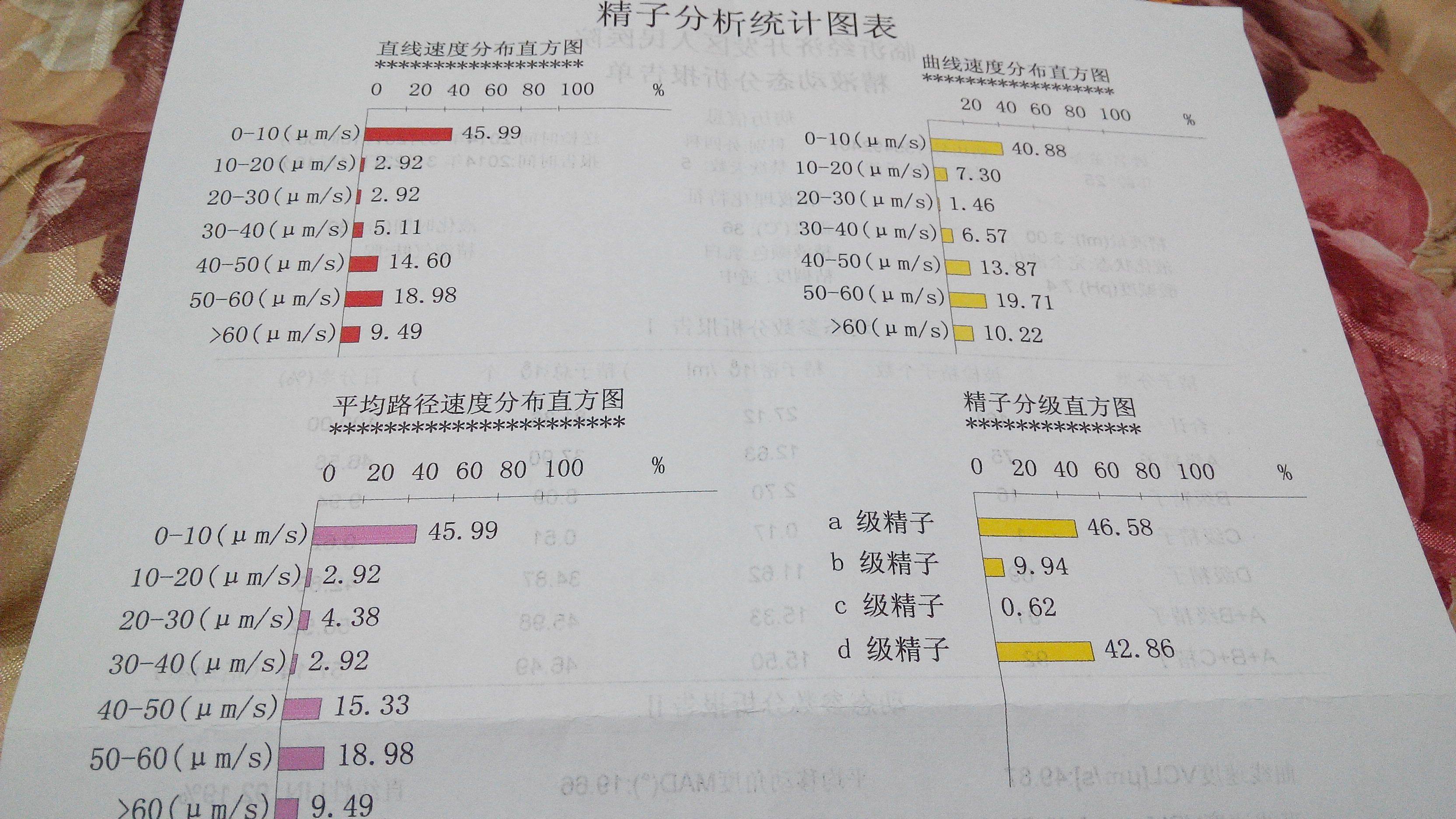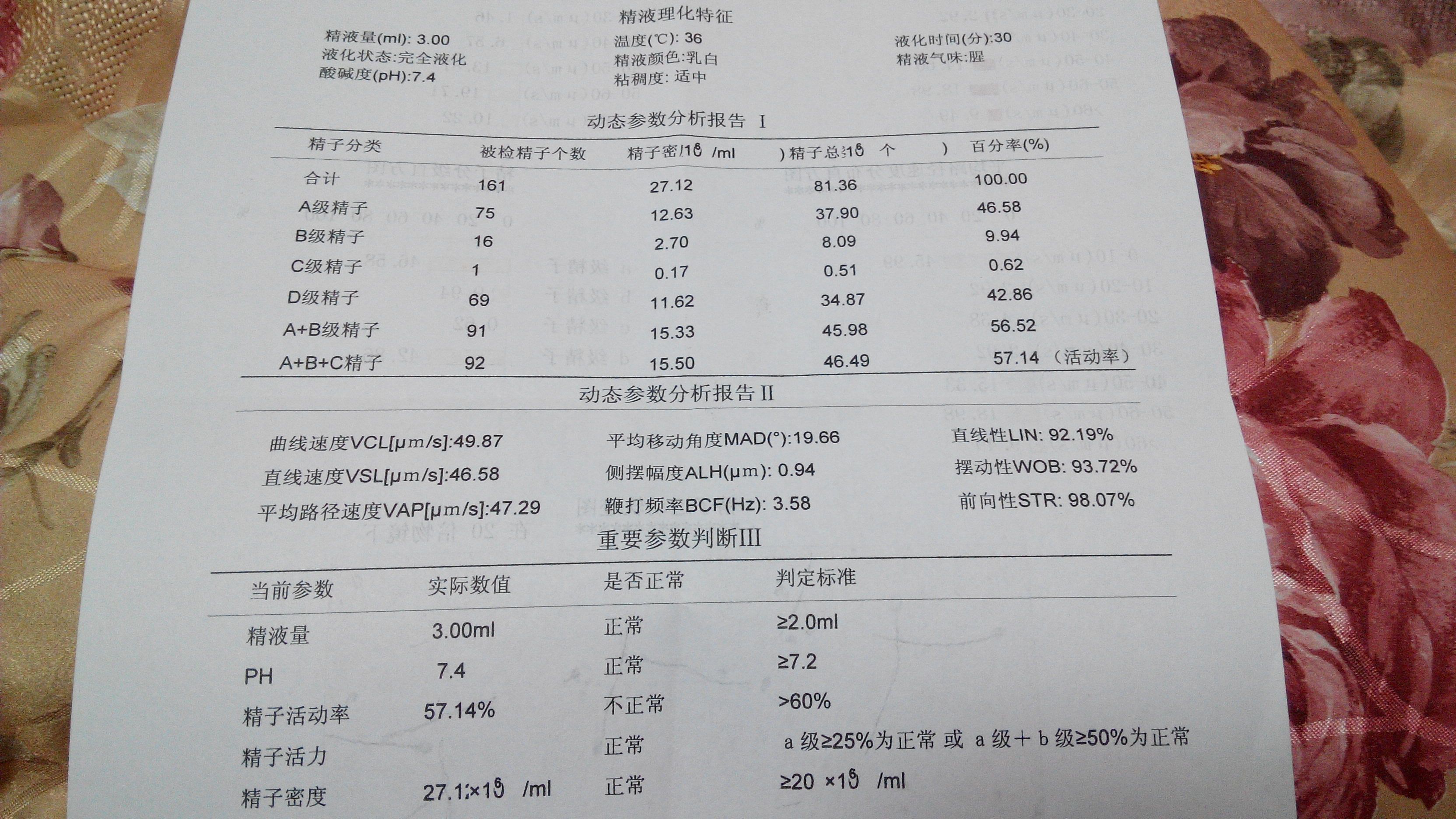 病情分析: 你的这份报告结果,虽然AB不达标,但A级精子不少,有可能生育,建议禁欲7天复查。 指导意见: 精子活力低,正常80~90%,至少60%,AB至少50%,多见于精索静脉曲张,生殖系统感染,应用某些抗代谢药物(硫唑嘌呤、甲氨蝶呤与6-巯嘌呤)、雌激素、氧化氮芥等。建议进一步检查,以便对准病因...