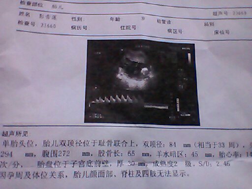 33周了双顶径84mm,头围294mm,腹围272mm,股骨长65mm,羊水深度45mm,胎盘厚30mm,想知道胎儿现在多重 点击展开 匿名用户 2014-10-20 15:46 为您推荐: 其他回答 你好,胎儿体重的计算公式Y=-2232.56+747.42FL,Y就是体重,FL是股骨长,所以,根据你提供的数据,胎儿的体重是Y=747.42*6.5-2232.56=2625克,也就是将近5斤2两。 pumavictory 2014-10-21 14:14 相关问题 怀孕32周宝宝有多重?双顶径84mm,股骨长62mm,腹围262mm 羊水最大深度56mm,胎盘厚径29mm 我的胎盘位置在于子宫前壁,是不是不在肚脐下面,羊水最大深度:45mm正常吗? 我的胎盘位置在于子宫前壁,是不是不在肚脐下面,羊水最大深度:45mm正常吗?