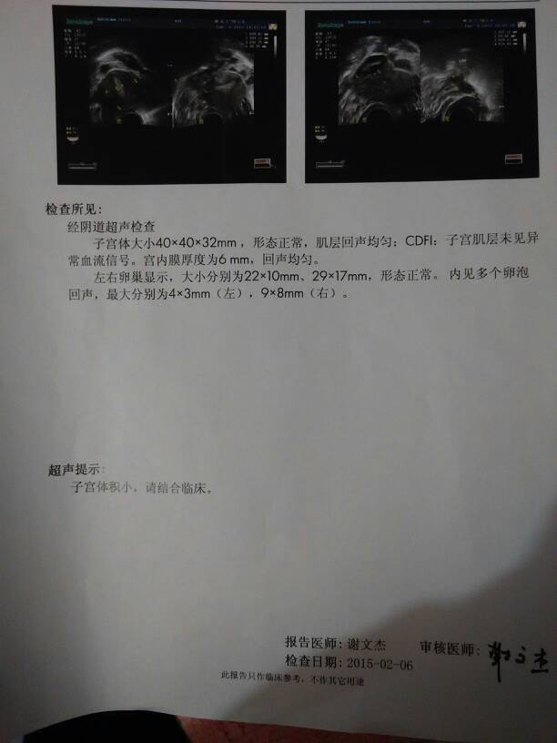 B超的单,不知道有没有问题?请各位帮忙看看 B超的单,不知道有没有问题?请各位帮忙看看 点击展开 ……_4ppz 2015-02-09 12:48 为您推荐: 其他回答 你好,根据检查结果,除了子宫偏小以外别的都是正常的,子宫体积小一般是和遗产有关系或者先天发育的不是很好,但你只是偏小,一般是不会影响生育的,双侧卵巢的大小是正常的 żе㻵2011 2015-02-09 13:00 相关问题 看看,我的B超单吧,有没有问题? 请帮我看看b超数据有没有问题 恳请各位帮忙看看我的B超单子 28周的宝宝