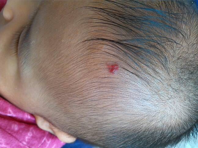 儿子的头上长了一块血管瘤,看样子是草莓状血管瘤,刚出生的时候没有,二十多天的时候很小,现在宝宝两个