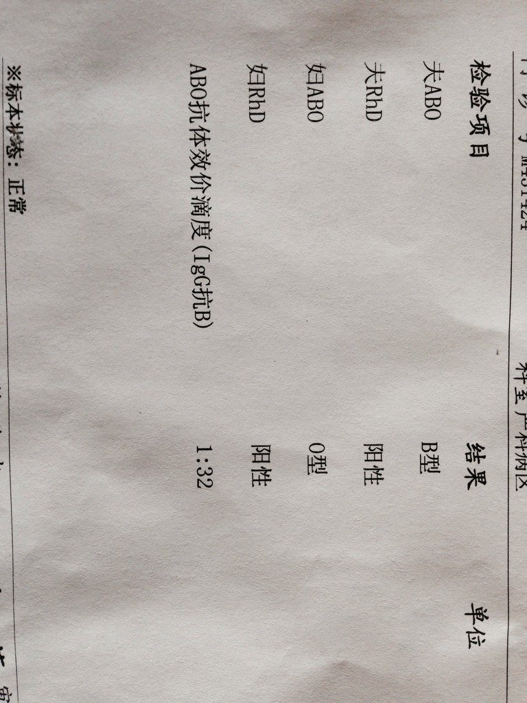 有血型不合应检测孕妇血清中IgG抗A和抗B抗体,如果抗A或抗B抗体>1:64,提示有发生新生儿ABO溶血的可能。你的抗B抗体滴度为1:32,大于1:64,因此有发生新生儿ABO溶血的可能,但不要担心,这种溶血大多症状较轻,其中只有一部分新生儿可能发生明显的黄疸。