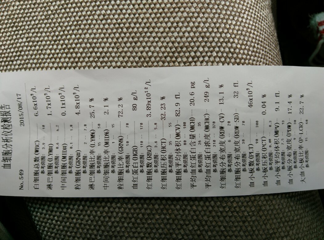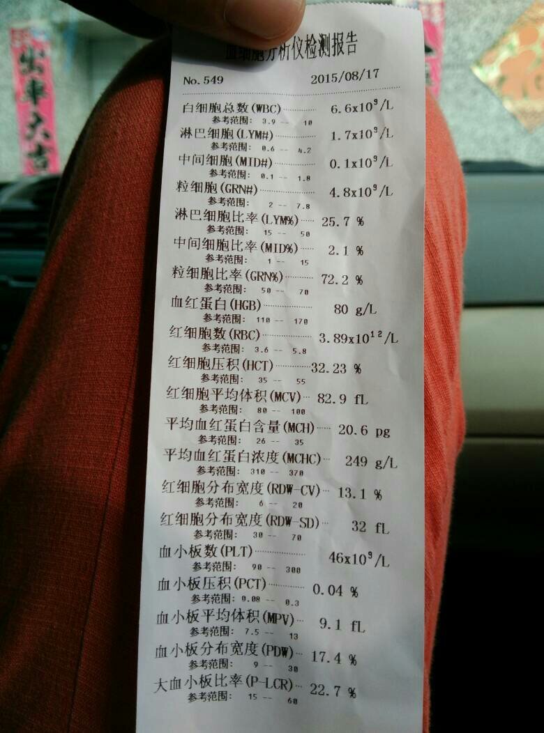 您好这是孩子的血细胞检测报告单,上面有几项偏低,比如血红蛋白、红细胞压积、平均血红蛋白浓度、平均血 您好这是孩子的血细胞检测报告单,上面有几项偏低,比如血红蛋白、红细胞压积、平均血红蛋白浓度、平均血红蛋白含量、血小板数、血小板压积,具体请看图,谢谢,请专家解答! 点击展开 匿名用户 2015-08-18 08:11 满意回答 现在有好多吉崭小孩偏食消瘦都有些贫血,也眠安不一定是疾病泳间厉原因造成的。 可能我是弱者 2015-08-18 08:23 宝宝知道提示您:回答为网友贡献,仅供参考。 为您推荐: 其他回答 就是贫血 匿名用户 2015-08-18 08:24 几岁,性别 匿名用户 2015-08-18 08:22 相关问题 血红蛋白 红细胞压积 平均红细胞体积 平均红细胞血红蛋白量 平均红细胞血红蛋白浓度低是什么情况 女儿1岁4个月,昨天感冒咳嗽,晚上发烧,吃了退烧药也没有用,早上去了儿童医院,大夫叫检验血细胞,血红蛋白浓度是67,大夫叫住院输血,不知道该怎么办了,一个小感冒 血红蛋白,血细胞比容,平均血红蛋白浓度,平均血小板体积,嗜酸性细胞绝对值都底是怎么回事