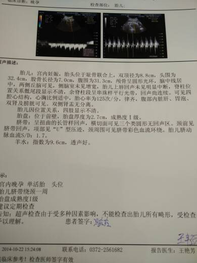 一切正常胎位正脐带绕颈一周胎盘一级功能良好羊水偏多不过还行胎儿大概5斤左右