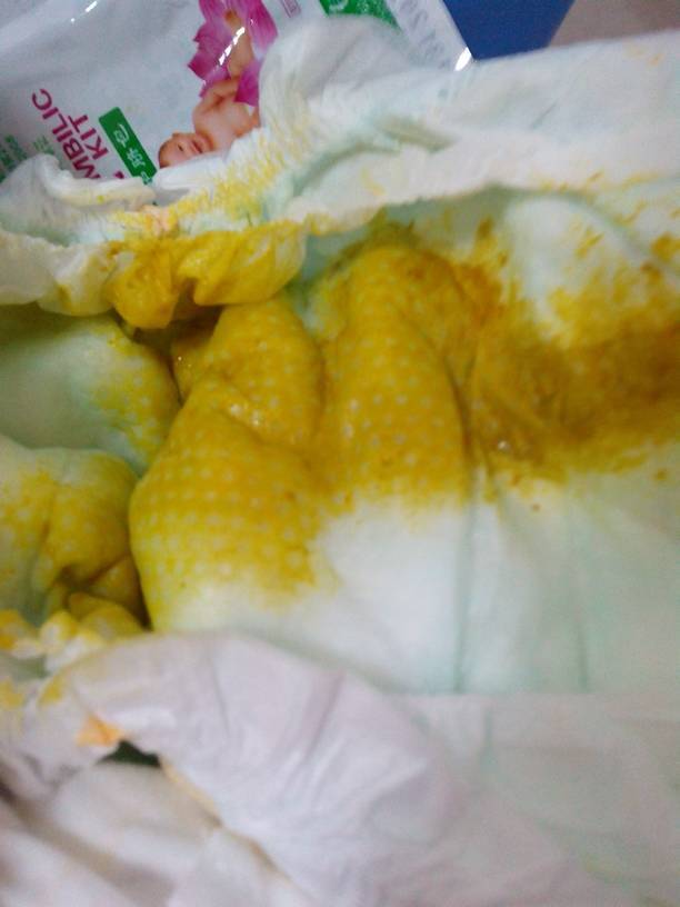宝宝出生4天了,今天拉的大便稀稀的,闻着有酸味 刚出生的前两天母乳少,吃了点奶粉 大便如图