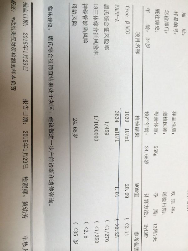 从提供的稼实报告看,hcg的校正值20.69超过正常范围,同时唐氏综合症1/459属于临界风卫院险,说明胎串刺禁儿患病的风险相对较高,但不是确诊。建议遵医嘱做产前诊断进一步排除。