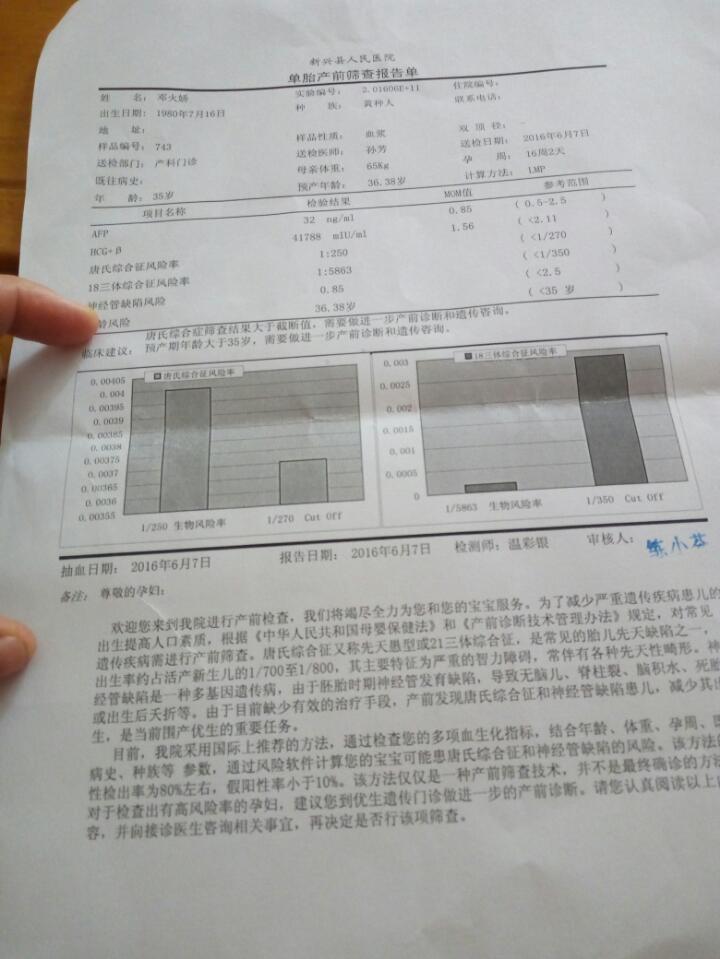 唐氏综合症风险率检查结果是,大于截断值,需要做进一步产前诊断和遗传咨询,严重????