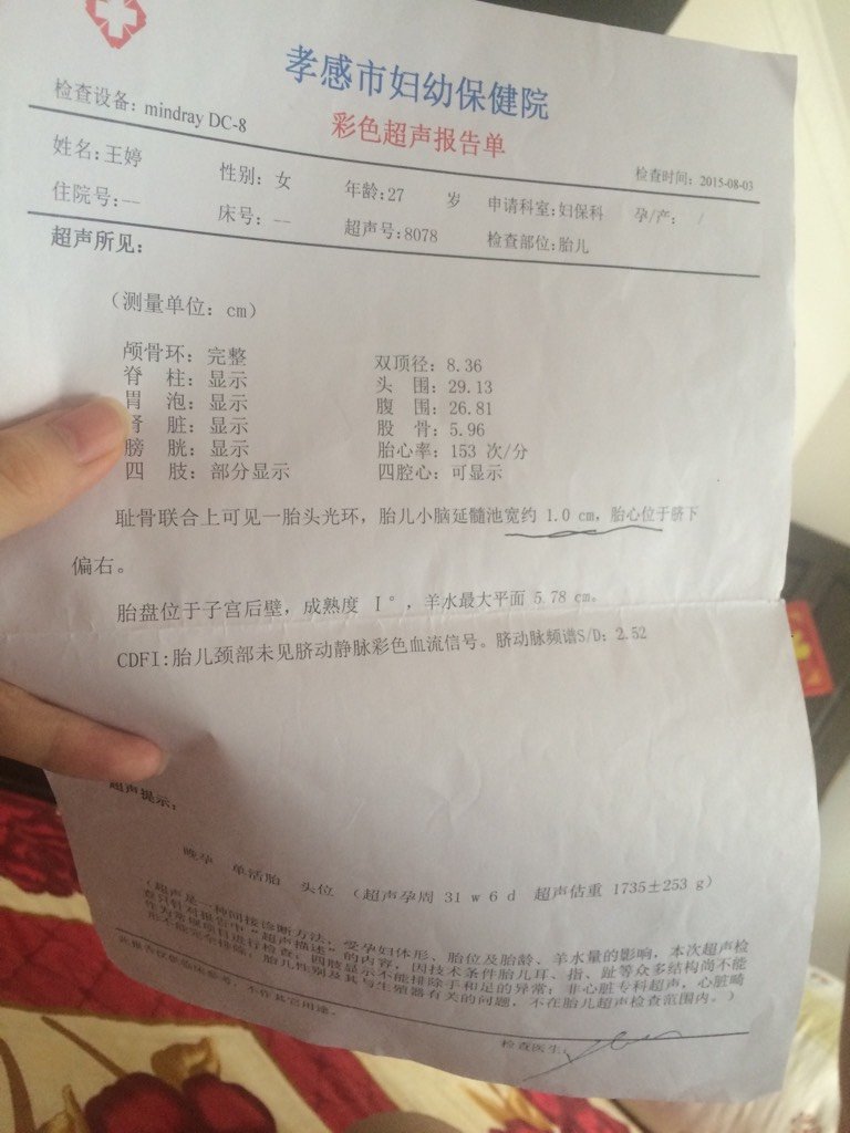 这是31周2做的b超有显示胎儿小脑延髓池宽约1.0cm.后来335天换了一家医院做胎儿常规b超 这是31周➕2做的b超有显示胎儿小脑延髓池宽约1.0cm。后来33➕5天换了一家医院做胎儿常规b超检查后,上面没有显示了,这到底是什么原因呢? 点击展开 My cc _ 2015-08-20 13:13 为您推荐: 其他回答 没事了.... 一琛宝宝 2015-08-20 16:45 换家医院就会不一样 Crazy‖°矜持瘋紙 2015-08-20 16:14 问医生了吗 不知道叫什么 2015-08-20 15:05 宝妈好孕! ,*橙子 2015-08-20 14:53 医生怎么说 185*****836_5BS4 2015-08-20 14:33 加载更多 相关问题 孕28周B超检查胎儿小脑延髓池宽约1 0cm正常吗? 胎儿33周了,B超显示,胎儿小脑延髓池宽1 01cm,羊水最大深径7 8cm,怎么办? 我妻子怀孕25周,做四维彩超,医生说胎儿小脑延髓池宽1 2厘米 请问有谁知道胎儿是不是有问题?谢谢!