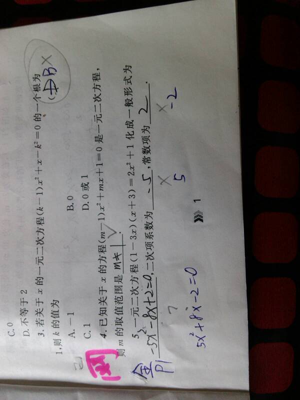 将1代进去得到k为1或0,但题目有说原方程式关于x的一元二次方程,说明x的平方为最高次项,如果k等于1的话,x的平方乘以0等于0,该项就没有了,也就是不存在x的平方,不符合一元二次方程的定义,所以k的值只能等于0