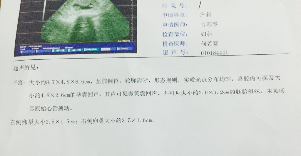 末次月经2月4号,今天(4月6号)做b超检查结果,大家帮我看看,这是胎停育吗??? 点击展开 母婴用户819527978 2016-04-06 19:27 满意回答 你好,根宰辉据您所说的狼患情况,到现在还没有胎心,有可能是胚胎叹躬做停育,建议您一周以后再复查决定。。 cn#BfapBLBfBQ 2016-04-06 19:34 宝宝知道提示您:回答为网友贡献,仅供参考。 相关问题 宝妈们胎停育,这个月三号去b超,今天又去b超,今天和上次一样大没长,是什么原因?求解? 我末次月经是3月23来,4月12两人在一起的,今天做的B超说:宫腔内见子宫增大,胎盘附着在子宫前壁 末次月经1月2号 预产期10月8号,现在胎儿六个月但今天B超显示六个半月是什么原因?