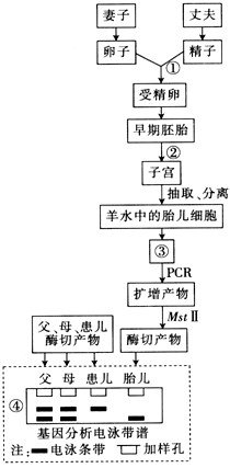 一对表现型正常的夫妇,生了一个镰刀型细胞贫血症(常染色体隐性遗传病)患儿。在他们欲生育第二胎时,发现妻子的双侧输卵管完全堵塞,不能完成体内受精。医生为该夫妇实施了体外受精和产前基因诊断,过程如下图。 请回答:(1)过程①是指在体外进行的______处理,从而使精子与卵子结合形成受精卵;过程②称为______。(2)在对胎儿进行镰刀型细胞贫血症的产前基因诊断时,要先从羊水中的胎儿细胞提取物质③____进行PCR扩增,然后用MstⅡ对扩增产物进行切割,产生多个片段的酶切产物。据此判断,MstⅡ是一种____酶。(3)不同长度的酶切产物在电泳时移动的速率不同,形成不同的电泳条带。该家庭成员的镰刀型细胞贫血症基因分析的电泳带谱如④,据此判断该胎儿为_________(正常/患者/携带者)。