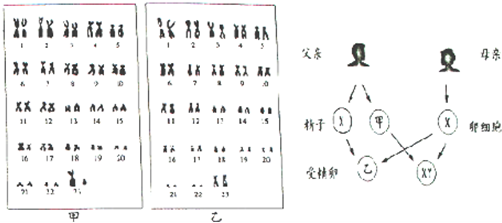 (1)染色体是细胞核内易被碱性染料染成深色的物质,由蛋白质和DNA组成,是遗传物质基因的载体;分析图1可知,男性、女性的体细胞中都含有23对、46条染色体了减. (2)分析图1可知:男、女体细胞中都有23对染色体,有22对染色体的形态、大小男女的基本相同,其中有一对染色体在形态、大小上存在着明显差异,这对染色体与人的性别决定有关,称为性染色体;女性体细胞中的性染色体形态大小基本相同,称为XX染色体,男性体细胞的性染色体中,较大的一条命名为X染色体,较小一条称为Y染色体.因此图1中的甲图表示男性的染色体排序. (3)男性的睾丸既是男性的性腺,又是男性的主要性器官,它的功能是产生男性生殖细胞精子和分泌雄性激素;男性的性染色体是XY,在产生生殖细胞的过程中,这对染色体分离,分别进入不同的精子中,即男性产生的精子分别含有X性染色体或Y性染色体;因此图2中精子甲的性染色体是Y. (4)胚胎发育的场所是母亲的子宫,即受精卵在母亲的子宫里耻夕发育成胎儿;图2中受精评梅行卵乙的性染色体组成是XX,将来发育成女性.(4)由于男性可产生数量相等的X精子与Y精子,加之它们与卵子结合的机会相等,所以每次生男生女的概率是相等的.在整个人群中男女性别之比大致1:1.若该排序图表示的是电视剧《鲜花朵朵》中七个女儿父母的染色体组成,假如他们再生一胎,是男孩的可能性为50%. (5)每种生物体内的染色体数目是一定的.人的体细胞中多了或少了一条染色体,都可能导致严重的遗传病.如先天愚实际是21号染色体多了一条不是一对儿是3条.故答案为:(1)DNA;46(2)一;甲(3)睾丸;Y(4)子宫;女(5)50% (6)遗传病