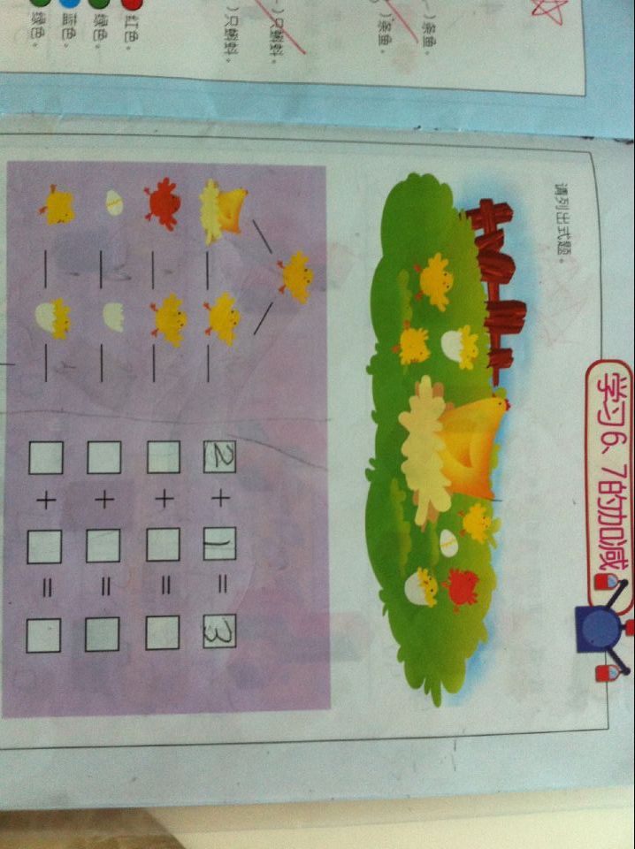您这大人不会数数吗??? 第一行 翻译过来是:几只老母鸡+几只欢呼的黄色小鸡 经数数查找发现竟然是当然是2+1 第二行 几只红色的鸡+几只欢呼的鸡 经数数查找 发现竟然是 1+2 几个鸡蛋+几个蛋壳 当然是1+2 几只奔跑的小鸡+几个坐在蛋壳里的鸡 1+2