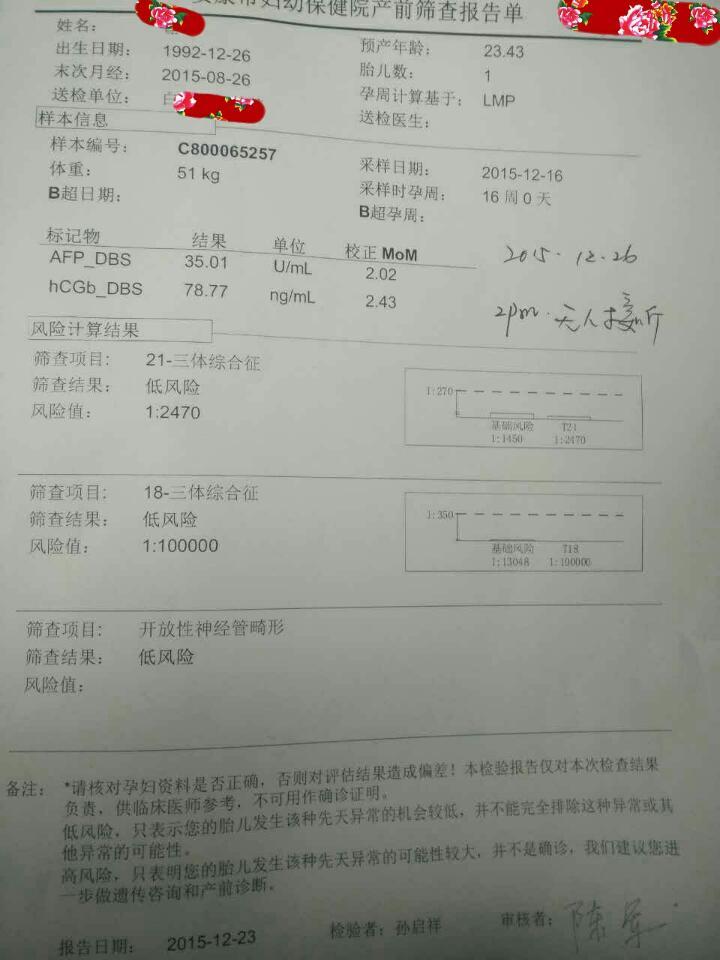 唐筛结果,有没有妇产科医生帮我看下,结果是不是有点高?需不需要做其他检查? 唐筛结果,有没有妇产科医生帮我看下,结果是不是有点高?需不需要做其他检查? 点击展开 牛掰小子他老妈 2016-01-02 21:33 为您推荐: 其他回答 上面那两个标记物不会看,下面三项低风险 糊涂婆 2016-01-02 22:05 四维彩超做一个吧! 刘琦刘晔 2016-01-02 22:05 去医院问医生 周太太👫💏💑💒 2016-01-02 21:57 录用的啊, 恩泽宝贝👄 2016-01-02 21:56 低风险就没事 家有俩宝是个好😘 2016-01-02 21:51 加载更多 相关问题 唐筛报告!有没有专业的妇产科医生帮我看一下这种情况需要复查 你好,我有一个朋友,做了一个唐筛检查,她是21三体风险是45,标准值是270,按她这个数值,是不是 孕早期的时候吃了不少上好佳鲜虾片,现在32周了,没做唐筛和四维,B超检查正常,对宝宝有没有影响?