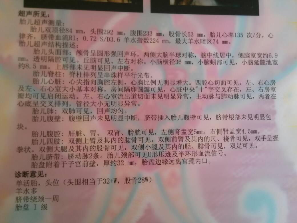 指导意见:你好,根据B超提示 胎儿32周左右,有脐绕颈一周,羊水还算可以,后期会逐渐减少。其余各项指标都很正常,不需要担心。孕期要按时产检,做好孕期保健,饮食方面要多喝水,多吃新鲜的蔬菜水果,增加营养,适量运动,忌油腻辛辣的饮食。祝您健康。