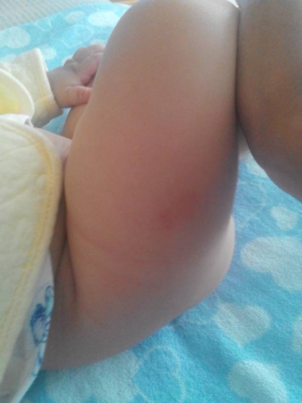 宝宝是31号去打的预防针,打针那天还流了一小点血,前两天没注意 今天早上感觉他大腿这里有点青,而且