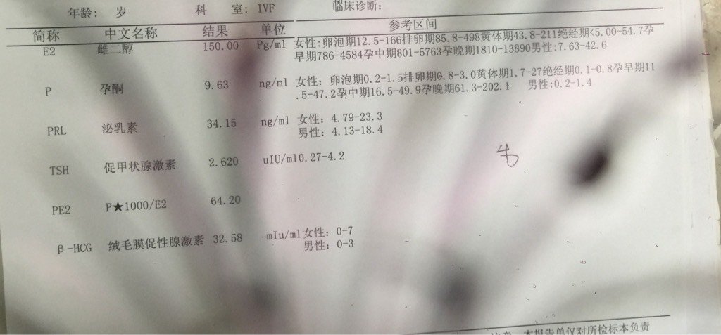 我的报告单。囊胚第12天,我还有希望吗雌二醇 150 Pg/ml,孕酮 9.63 ng/ml,泌乳素 31.15 ng/ml,促甲状腺素 2.620 uIU/ml,PE2 P⭐️1000/E2 64.2HCG绒毛膜促性激素 32.58 mIu/ml不知道的朋友不回答,知道一点的都需要回答谢谢