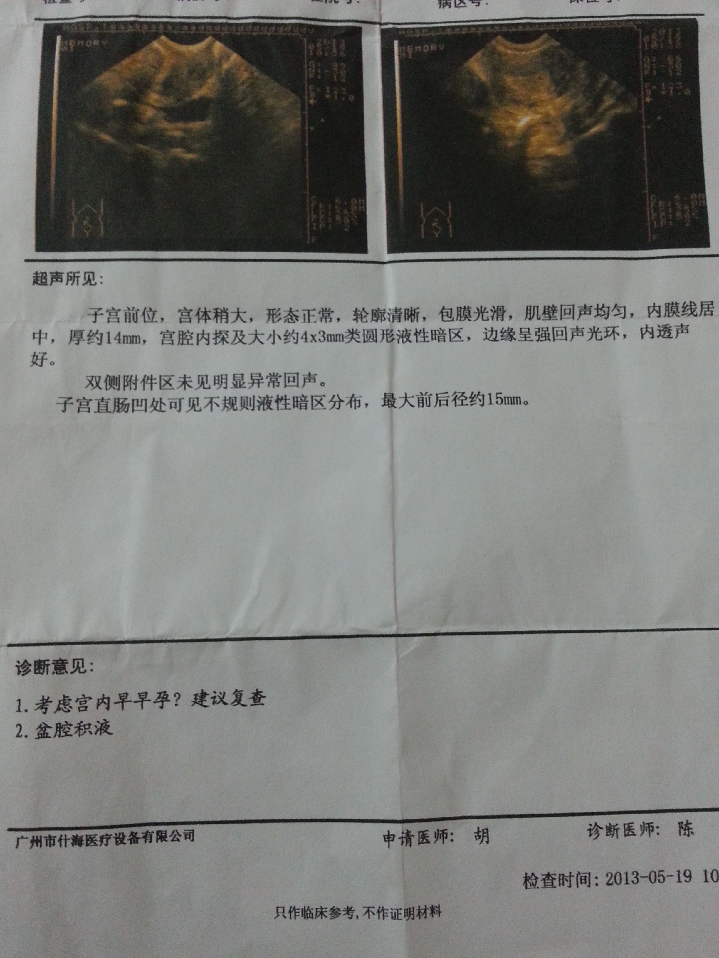 阴超检查诊断意见有两个,一个是考虑宫内早早孕,另一个是盆腔积液