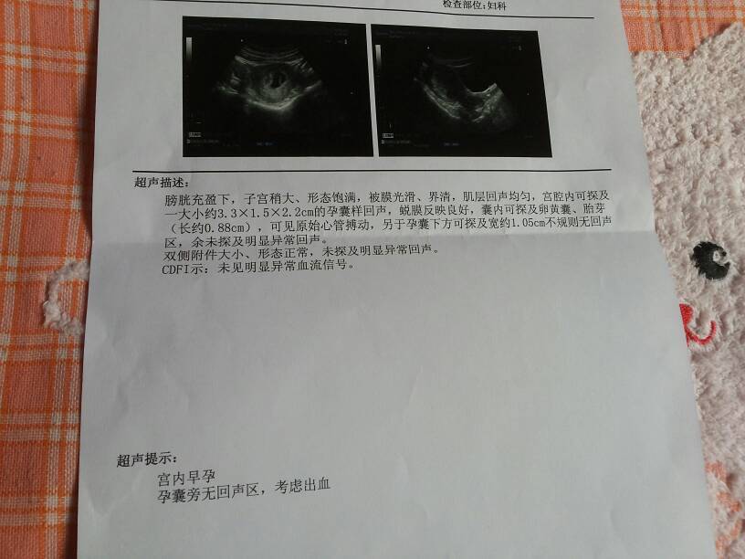 请帮忙看一下早孕的b超报告,孕囊下方有1.05cm不规则无回声区o(︶︿︶)o唉,到底什么原因,需 请帮忙看一下早孕的b超报告,孕囊下方有1.05cm不规则无回声区o(︶︿︶)o唉,到底什么原因,需要保胎吗? 点击展开 匿名用户 2014-12-21 13:32 为您推荐: 其他回答 你好,你的这个其实就是积血,最好还是保胎,可以考虑补充黄体酮,这个是可以稳定胎儿的,否则可能会有出血等情况 匿名用户 2014-12-21 14:26 相关问题 跪求回答 怀孕了 很小 不规则 无回声 上个周末做检查是早早孕 宫内没有孕囊 这次是有孕囊 又 早孕查出弱阳b超盆腔内查见不规则无回声区最深处约0 7cm,没有查见孕囊,是什么意思 早孕查出弱阳b超盆腔内查见不规则无回声区最深处约0 7cm,是怀孕了吗