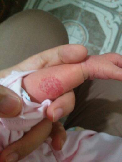 我闺女出生18了 这个红印出生后几天在家洗澡时发现的,摸起来平平的像淤血不知道具体是什么,至今不