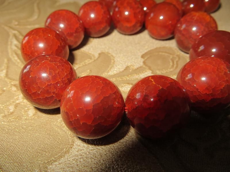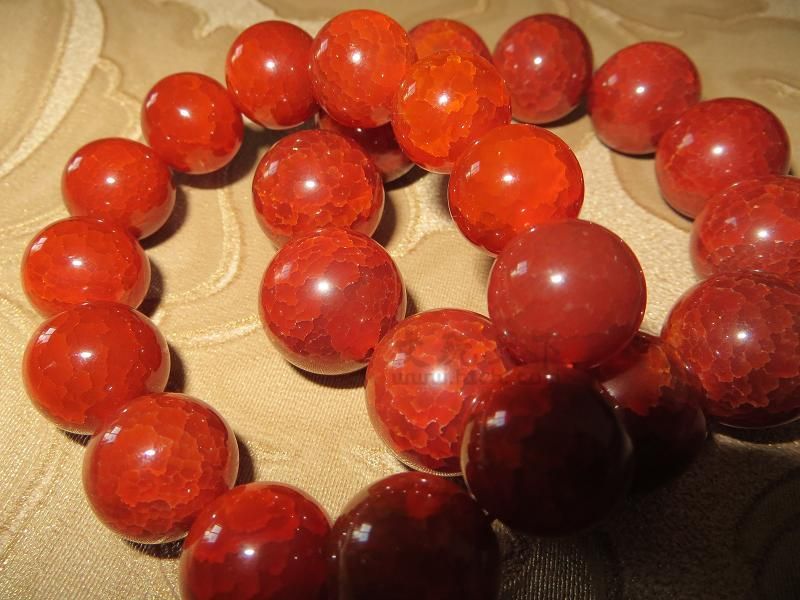 您好您的宝贝是玛瑙的,药们不过可不是什么冰纹红玛瑙这个名称也是卖家的俗称,并不是标准定名。形容具有一定冰透纹的红玛瑙不过您的这个冰纹是人工做上去的,纹路太过均匀采用高温加热骤冷这其中有一定的技术方法,在此不详述。套豆脑玛瑙就形成崩纹,本体的玛瑙还是玛瑙只不过纹路非天然,这样的手法适用于在龙纹玛瑙和部分低廉的仿天珠玛瑙饰品中注意和下面的冰纹红玛瑙对比常劣一下吧真品的纹路不会那么规则的,呵呵