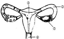 图中 ①卵巢, ②输卵管, ③子宫, ④阴道,(1)(2)(3)女性生殖系统主要包括卵巢、输卵管、子宫、阴道等. ①卵巢能产生卵细胞并分泌雌性激素; ②输卵管的作用是输眠逼送卵细胞,也是受精作用的场所; ③务菜子宫是胚胎发育的场所;泳肆兔 ④阴道是精子进入女性体内和婴儿出生的通道.(4)进入青春期,女孩的性器官卵巢迅速发育,产生卵细胞,并分泌雌性;激素.故答案为:(1)卵;雌;1;卵巢;(2)2;输卵管;受精卵;(3)3;子宫;4;阴道;(3)卵巢;卵细胞;雌性