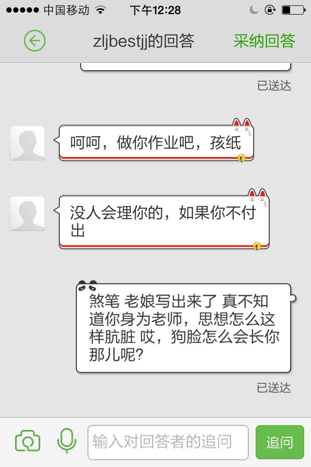 有老师在上面让发乳房给讲题 很肮脏!望明察(系统版本:iOS7.0.4,客户端版本:v3.5.4) 点击展开 匿名用户 2014-03-08 12:29 为您推荐: 其他回答 你好,3.3版本已经开始提供了匿名举报功能,如果您发现有人违规,您可以在对话页面,长按某条气泡进行举报,我们都会有相应的工作人员跟进处理。另外,如果某些人对您已经产生骚扰,您可以长按对方的头像,以屏蔽来自对方的消息提醒。 匿名用户 2014-03-11 18:26 相关问题 删除"私密问答"你这还要不要小孩用啦?(系统版本:iOS6 0,客户端版本:v3 3 2) o型爸爸跟a型妈妈生下来的宝宝会不会有先天性的疾病(系统版本:iOS7 1 2,客户端版本:v4 得了肺癌,又患了宫颈糜烂,是否能用要栓进阴道?会有影响吗?(系统版本:iOS8 1,客户端版本:v