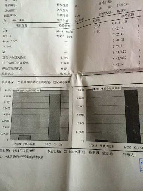 能帮忙看看我的唐氏筛查风险值正常吗? 能帮忙看看我的唐氏筛查风险值正常吗?😛 点击展开 漫步山岚 2014-12-25 14:37 为您推荐: 其他回答 低风险就没事。 荥洋嘛嘛 2014-12-25 19:23 医生没跟你说啊! 好怕→_→ 2014-12-25 17:21 从唐氏筛查报告看,唐氏综合症、18-三体综合征和开放性神经管缺陷都是低风险,说明胎儿患这些病的可能性极小,但不是绝对的。建议暂时观察,每月定期产检。 wzlzx520 2014-12-25 15:46 医生没有告诉你 辰皓宝贝 2014-12-25 15:38 祝宝妈好孕哦!!正常的 小倩麻麻 2014-12-25 15:13 加载更多 相关问题 急、急,唐氏筛查高风险问题,请大家帮忙看看,谢谢! nt值是正常的,唐氏筛查也应该没风险吧 唐氏筛查风险值1:526