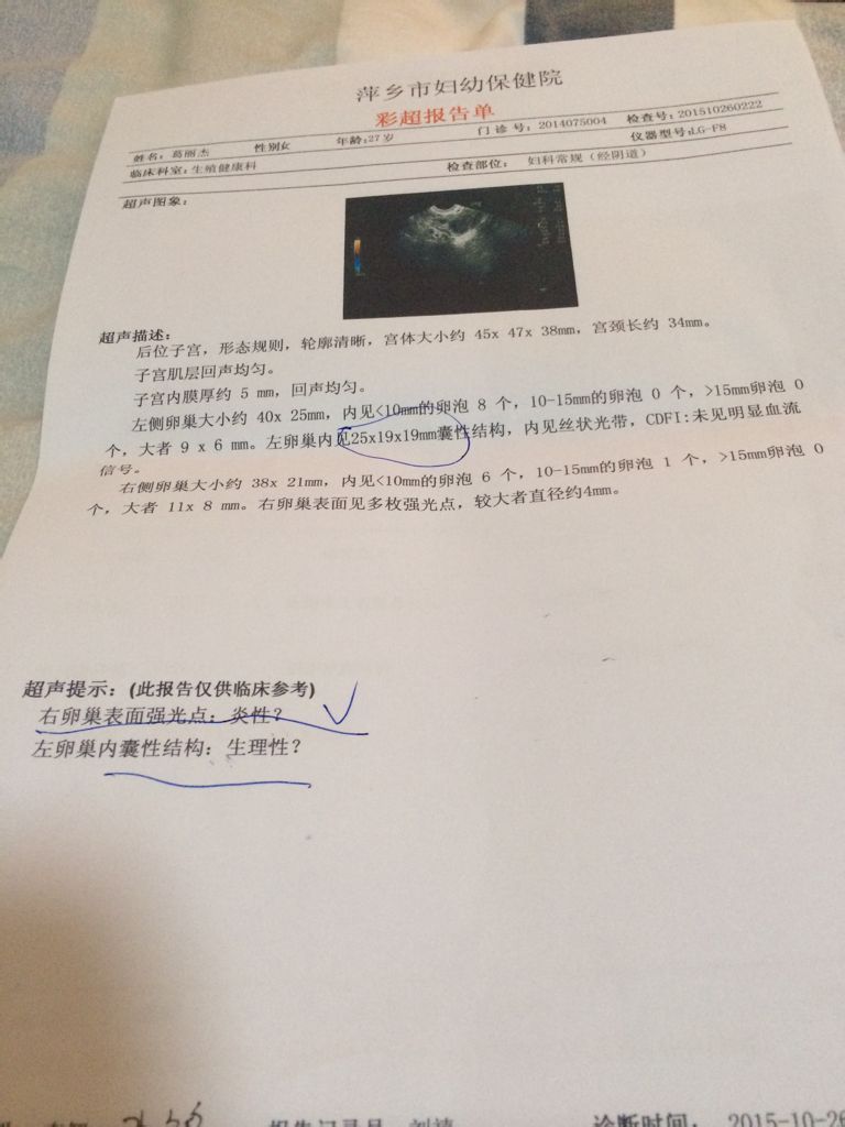 今天去检查不孕不育,医生说很严重,听了心里很害怕,求懂的指点下,是不是真的很严重,谢谢啦! 点击展开 匿名用户 2015-10-26 14:54 满意回答 你好,单纯从这个超声检查结果来看,并不是很严重的,你先不炼叹次要过于紧张。建议你继续观察,如果囊肿是生理性的,一般来说不会超过三个月就会自沃司己消失的训实。 莫如尽 2015-10-26 15:03 宝宝知道提示您:回答为网友贡献,仅供参考。 相关问题 今天去照了B超,看不懂,医生也没说什么,就说没问题,过三周再去检查,请高手指点!谢! 准备检查是否输卵管不通,是否有不孕不育 怎么和医生说?选择什么时候去就诊 各位医生你好:不孕不育有那些项目检查和费用