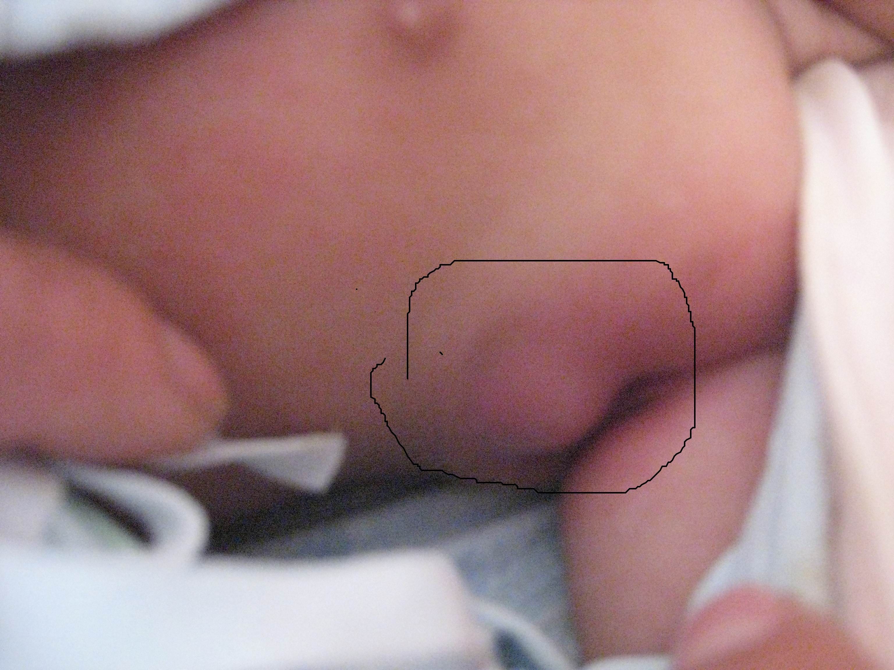 患者信息:女 病情描述(发病时间、主要症状等):出生32天婴儿,在左腋窝下有疙瘩,摸上去小孩就哭,不碰就不哭,其大小有1.5cm-2cm,详见图片,第二天比前一天要大许多 请专家帮忙分析(附:在医院做B超时,医生讲是在皮下长出的,)想得到怎样的帮助:想知道这个疙瘩是什么,对其小孩有影响不?曾经治疗情况及是否有过敏、遗传病史:无