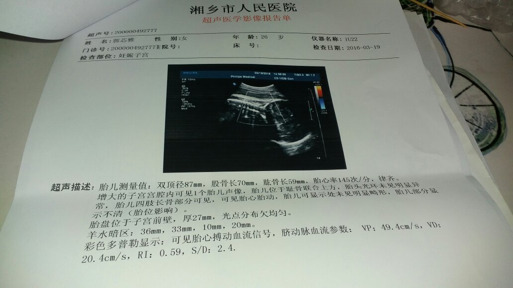 怀孕33周,B超显示宝宝双顶径87mm,股骨长70mm,肱骨长59mm,宝宝大概有多重? 点击展开 匿名用户 2016-03-19 23:26 满意回答 根据双顶径87mm,股骨长70mm这两个值估算,胎儿约2800克左右 彩色的风三 2016-03-19 23:28 宝宝知道提示您:回答为网友贡献,仅供参考。 相关问题 怀孕40周 宝宝双顶径91mm,股骨长73mm,腹径107mm,宝宝有多重 请问一下我怀孕39周加四天了,宫高35腹围98宝宝应该有多重了呀?还有医生说还没有完全入盆,这怎么 请问一下我怀孕39周加四天了,宫高35腹围98宝宝应该有多重了呀?还有医生说还没有完全入盆,这怎么