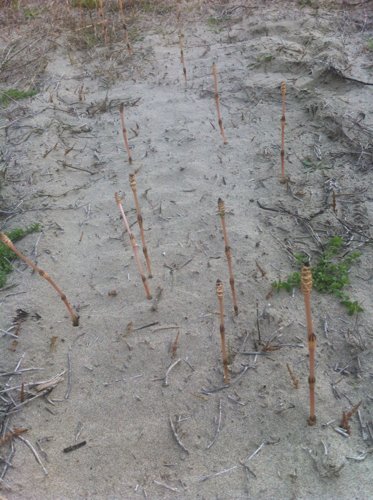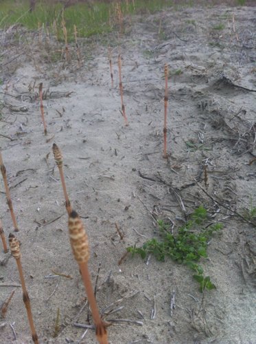 你好,这个是木贼科植物问荆,学名Equisetum arvense 中小型植物。根茎斜升,直立和横走,黑棕色,节和根密生细高点黄棕色长毛或光滑无毛。射富地上枝当年枯萎。枝二型。能育枝春季先萌发,高5-35厘米,中部直径3-5毫米,节间长2-6厘米,黄棕色,无轮茎分枝,脊不明显,要密纵沟;鞘筒栗棕色或淡黄色,长约0.8厘米,鞘齿9-12枚,栗棕色,长4-7毫米,狭三角形,鞘背仅上部有一浅纵沟,孢子散后能育枝枯萎。不育枝后萌发,高达40厘米,主枝中部直径1.5-3.0毫米,节间长2-3厘米,绿色,轮生分枝多,主枝中部以下有分枝。脊的背部弧形,无棱,有横纹,无小瘤;鞘筒狭长,绿色,鞘齿三角形,5-6枚,中间黑棕色,边缘命否膜质,淡棕色,宿存。侧枝柔软纤细,扁平状,有3-4条狭而高的脊,脊的背部有横纹;鞘齿3-5个,披针形,绿色,边缘膜质,宿存。孢子囊穗圆柱形,长1.8-4.0厘米,直径0.9-1.0厘米,顶端钝,成熟时柄伸长,柄长3-6厘米