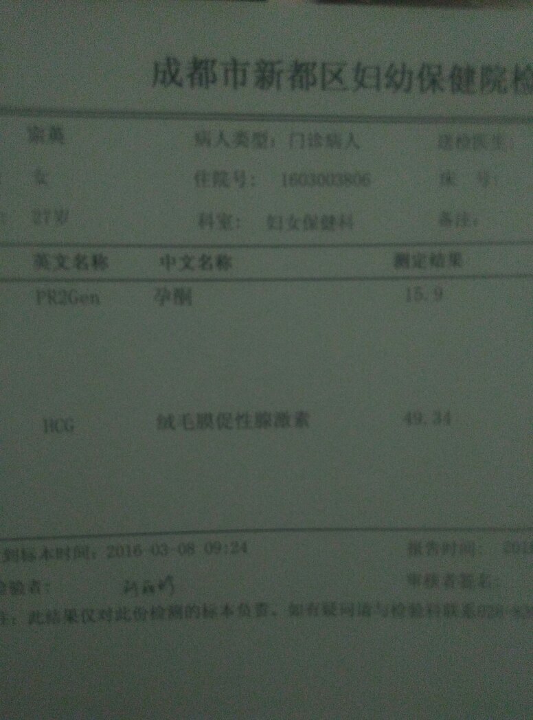 我2号打了2000单位的hcg,今天月经第25天 今天早上去验血了,麻烦帮我看看 点击展开 匿名用户 2016-03-08 15:41 满意回答 根据你的检查结果显之锈竖示,应该考虑是属于怀孕等原因引起的症状,应该注意观察。可以考虑在1周后进行复查,可以明确血HCG翻倍情况,明确胚耻贵胎发育状况。脂糕 太阳荣华医师 2016-03-08 15:43 宝宝知道提示您:回答为网友贡献,仅供参考。 相关问题 上个月月经4 20,验血B-hcG3469 75,孕酮25,麻烦医生帮我看看情况,偶尔有点点痛经的 9月18号来的月经,10月17号去医院验血HCG,血清人绒毛膜促性腺激素测定:32 89mIU/m hcg指数是6 7 医生说可能怀孕了可能没怀孕 今天早上起床上厕所有褐色分泌物 这个是月经还是什