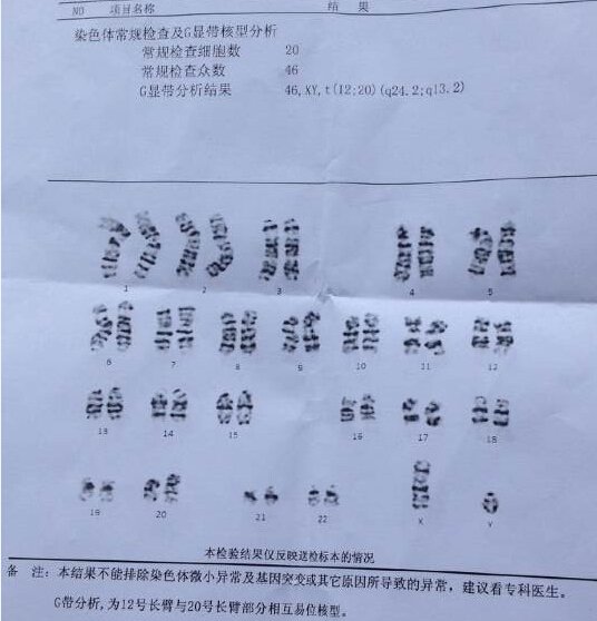 男的染色体易位,G显带分析结果46,XY,t(12;20) (q24.2;q13.2);请问还能要小孩吗,概率是多大 请问这个结果是什么意思,两条染色体的12和20号都易位了吗,还是一条易位,这样还能要小孩吗,概率是多大,女方已经多次流产了 点击展开 匿名用户 2014-09-03 10:01 为您推荐: 其他回答 问医生, 匿名用户 2014-09-03 10:18 相关问题 染色体男46 xy inv(9)女46 xx inv(9)能怀孕吗概率有多大 两次胎停开始都孕酮低,hcg值长的不好,是染色体异常引起的概率有多大 第一胎小孩有先天性心脏病,而父母染色体正常,第二胎还会有问题吗?正常的概率有多少啊?