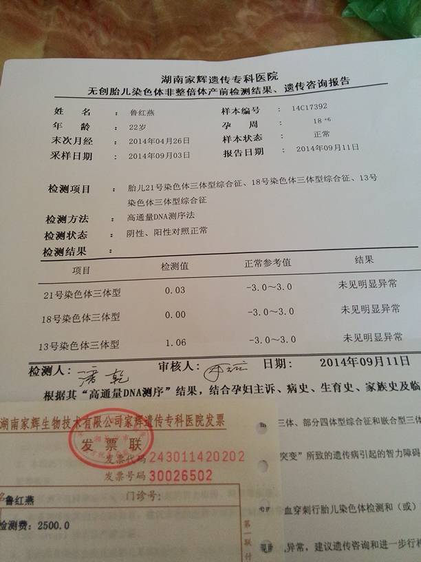 无创单子终于寄过来了,希望各位宝妈帮我看下正常吗? 无创单子终于寄过来了,希望各位宝妈帮我看下正常吗? 点击展开 一抹浅笑,深白色_11gk 2014-09-24 09:11 为您推荐: 其他回答 你好:从染色体检查结果来看胎儿是正常的,没有患有21三体、18三体及13三体综合征的。 继续按时产检就可以了。 19342988 2014-09-24 09:20 不是都写了未见明显异常?就是没事呀! tddiandian 2014-09-24 09:15 相关问题 希望做无创能安全通过 这俩天就要出单子啦 我想问一下宝妈们照的四维上面有没有膀胱、为什么我看有的宝妈四维单子上没有呢? 宝妈们,今天去照三维了,单子上面怎么看男女啊,好奇,我家老大男孩希望二胎是女孩,求答