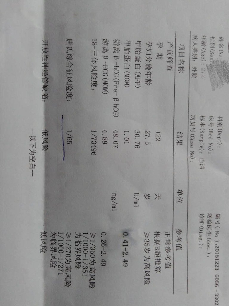 这个没什么问题的,只是你报告单上写着高风险啊,可能要进一步做羊水穿刺哦