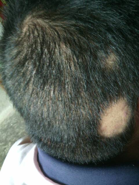 是斑秃。局部外用激素类药水,或鲜姜汁,刺激毛囊生长,一般3-6个月可以长出毛发 ;如果面积较大,可以口服激素,强的松15-30mg每天,逐渐减量,一般2个月内 毛发生长,但由于此药物有一定的副作用,需要医生指导下服用。此外多种维生 素和一些中药如何首乌片等也有辅助治疗的作用。