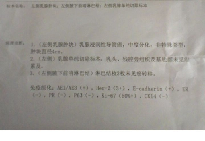 医生你好家人患有乳腺癌左侧切除病理诊断报告如下: 想问一下医生告知的4级是什么概念,是不是很严重了 。 点击展开 匿名用户 2013-11-28 14:09 为您推荐: 其他回答 效果比较好的 匿名用户 2013-11-28 14:11 相关问题 我查出乳腺癌前几天做的右乳房切除,下面是我的病理报告,还有个三项没出来,请医生给点建议,像我这个情 乳腺癌4期是一个什么概念? 请帮忙看下报告,稽留流产人流后的病理报告,医生说可能是葡萄胎???