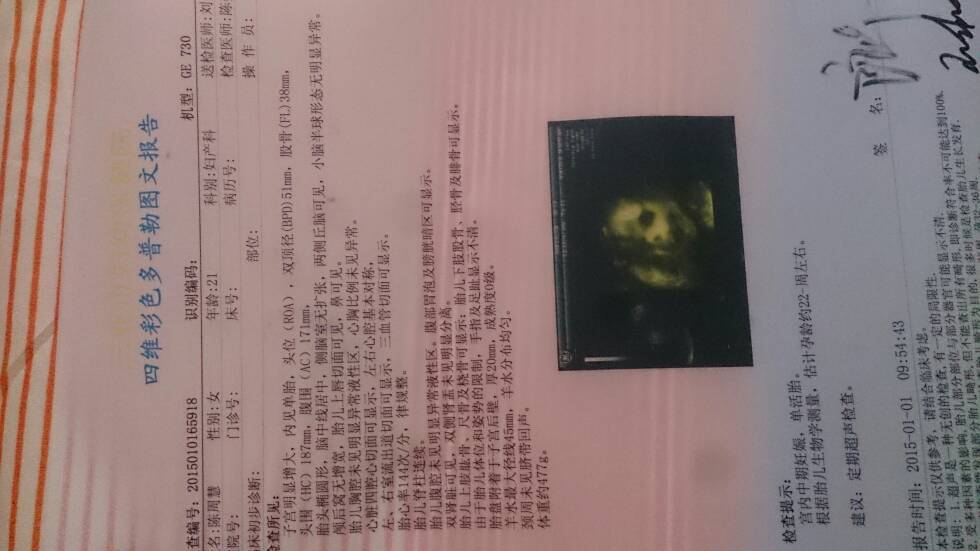 我老婆现在怀孕22周去照四维彩超的报告我看不懂四维彩超看到孩子在笑好高兴 点击展开 匿名用户 2015-01-10 23:18 相关问题 怀孕22周做四维彩超羊水多怎么办 我老婆怀孕五个半月做四维检查说胎儿颅内钙化,我知道严重么?什么原因造成的?孩子能要么? 我老婆怀孕十五周,现在需要做什么检查