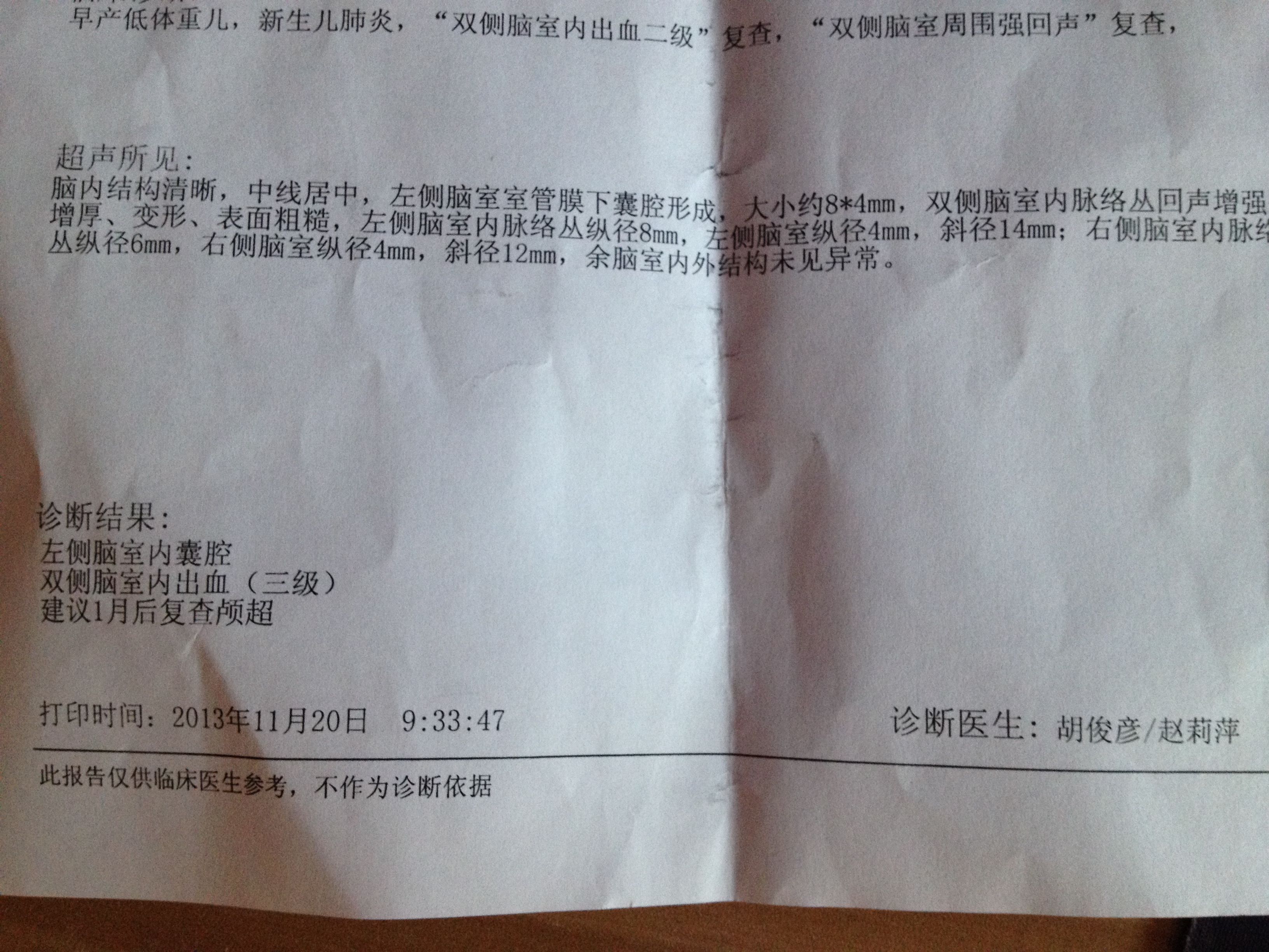 早产35+4,双侧脑室内出血二级,双侧脑室周围强回声,42天复查左侧脑室内囊腔,双侧脑室内出血三级 ,医生说不用治疗,请问需要注意什么? 点击展开 匿名用户 2013-11-22 08:56 为您推荐: 其他回答 病情分析: 您好,根据您的以上这些内容的描述,您的情况考虑是脑超的情况 指导意见: 您好,像您的这种情况考虑是进行加强检查是可以的,防止出血增加的情况 匿名用户 2013-11-22 09:08 相关问题 七个多月就生了是早产儿,现在一个月,今天去医院复查上面写的是‘双侧脑室后角增宽并脑室内出血,是怎么 脑室内出血,可不可以吃猪蹄 脑室内出血,可不可以吃老母鸡