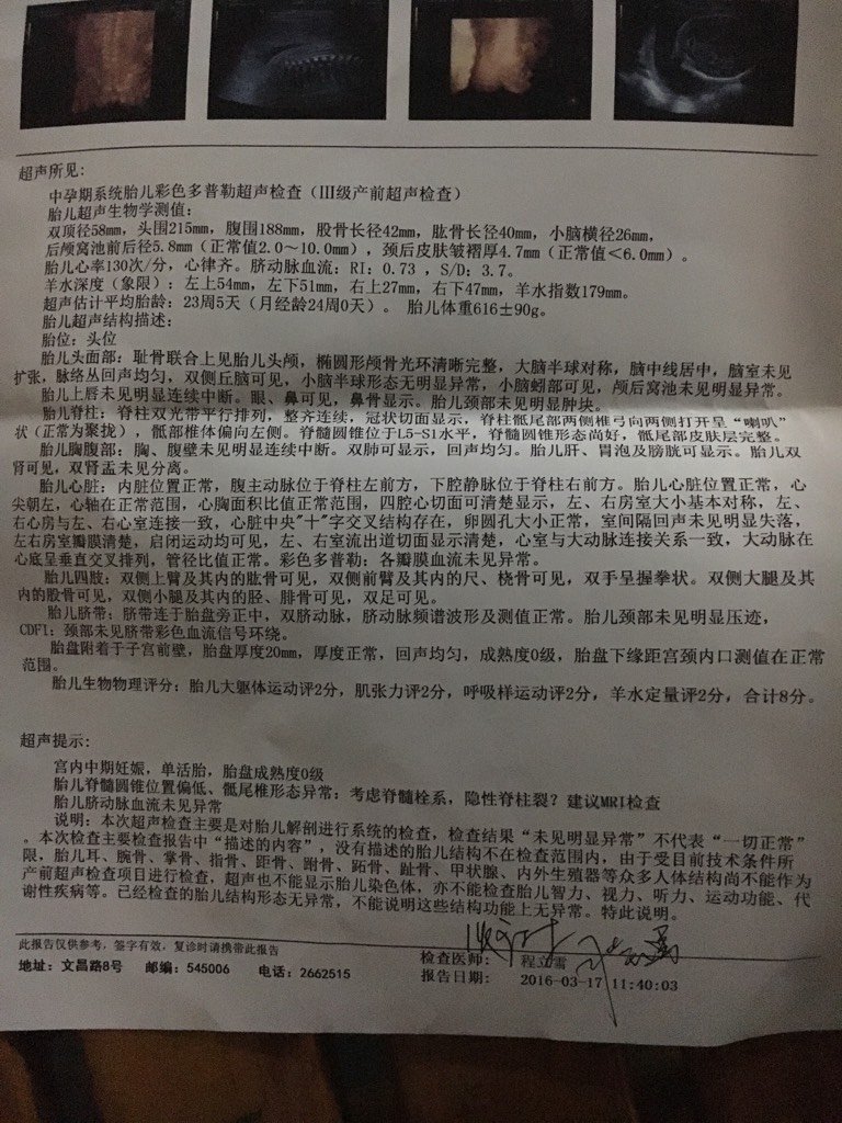 孕24周做4维彩超,显示胎儿脊柱骶尾部两侧椎弓向外两侧打开,呈喇叭形,骶部锥体偏向左侧 脊髓圆锥位于L5—S1水平,脊髓圆锥形态尚好,骶尾部皮肤呈完整,像这样小孩还能要吗 孕24周做4维彩超,显示胎儿脊柱骶尾部两侧椎弓向外两侧打开,呈喇叭形,骶部锥体偏向左侧。脊髓圆锥位于L5—S1水平,脊髓圆锥形态尚好,骶尾部皮肤呈完整,像这样小孩还能要吗 点击展开 189*****907_ax52 2016-03-21 10:16 为您推荐: 其他回答 听医生的吧 虔心的爱 2016-03-21 18:58 问医生吧! 李裕 2016-03-21 18:56 问问医生吧 程子腾 2016-03-21 18:49 问医生啊,上面不是建议做个检查吗 柚橙 2016-03-21 18:41 咨询下医生 势不两立。。 2016-03-21 17:41 加载更多 相关问题 彩超单子上面写着,内部回声不均匀,见少量钙化,胎儿脊柱骶尾部,唇未显示,请问这正常吗?什么意思啊? 每次照彩超胎儿都是仰面,医生说脊柱下端不是很清楚 孕31周彩超提示:胎儿脑中线丘脑后方可见1 4x0 8cm液性暗区,怎么解决?