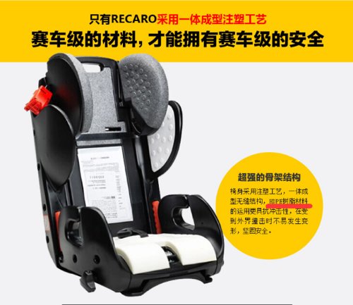 RECARO 儿童安全座椅的主体塑料件采用的是一体成型树脂材料HDPE;座椅包裹材料采用的是EPP