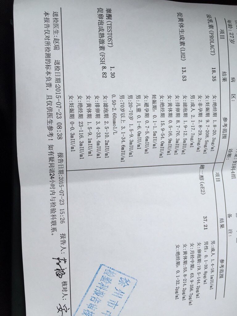 能帮我看看吗?我之前查出来是多囊卵巢综合症,现在是吃过3个月后的结果!正常吗? 能帮我看看吗?我之前查出来是多囊卵巢综合症,现在是吃过3个月后的结果!正常吗? 点击展开 158*****652_6Qu1 2015-07-30 14:31 为您推荐: 其他回答 其他是正常的 彩色的风三 2015-07-31 11:31 LH还是高了些。建议继续服用药物治疗三个月。 彩色的风三 2015-07-30 15:23 相关问题 B超后,帮我看看是否得了多囊卵巢综合症?要如何治疗,想要小孩! 我月经不正常,有点多囊卵巢 上次月经推后12天,以为怀孕了,结果失望 这次又推后14天,用试纸测弱阳,不知道怀孕了没,麻烦大家帮我看看 请姐姐们帮我看看,我是8号促排卵到19号是排卵后第12天,去医院验血医生说没有怀孕,试纸上显示下面又一道特别浅的印,,我是多囊卵巢,着急要宝宝
