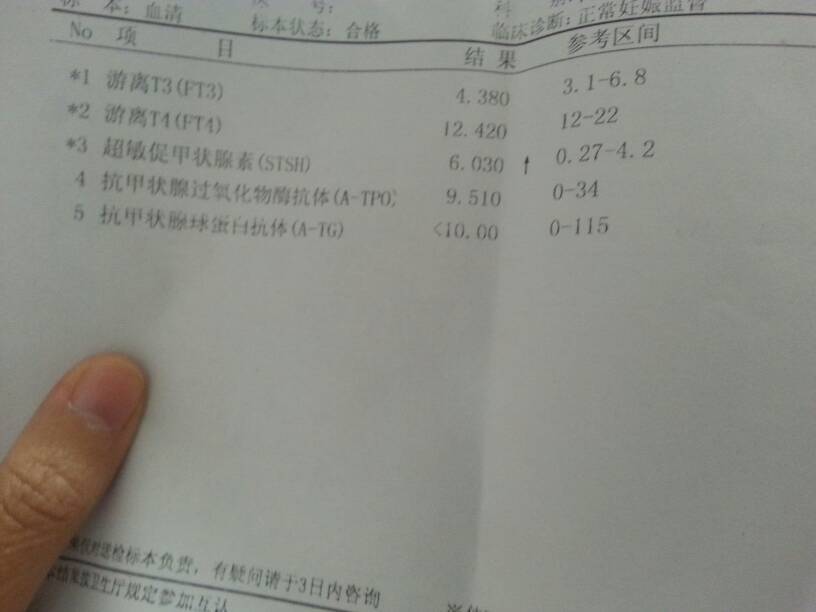 孕期,这张报告超敏促甲状腺素偏高,对小孩大人有什么影响?平常饮食有什么要注意的吗? 点击展开 匿名用户 2015-01-24 14:40 为您推荐: 其他回答 你好,从你提供的化验结果上看,你应该有甲减,建议在医生的指导下用药 维生素shao 2015-01-29 20:26 相关问题 孕期时促甲状腺素偏高,会不会影响宝宝的智力?担心 ing… 我孕期血糖偏高,需要注意些什么吗?尤其是饮食方面 年龄20 孕期19周今天刚去余杭区妇保医院查了下 促甲状腺素偏高 结果6 284 参考范围0 350-5 500 单位mTU/L