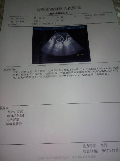 速求医生们给我看看我的B超单子,我现在4月 脉络膜囊肿是什么意思?发展下去是什么样的后果? 速求医生们给我看看我的B超单子,我现在4月。脉络膜囊肿是什么意思?发展下去是什么样的后果? 点击展开 ~待产的妈妈 2014-12-09 11:57 为您推荐: 其他回答 !!!!! 辣椒泡菜 2014-12-09 18:07 祝宝妈好孕 蔷薇草 2014-12-09 17:54 祝你好运。 Queen° 2014-12-09 16:22 祝宝妈健康好孕 萱宝的妈咪 2014-12-09 14:56 祝宝妈好孕 小木偶 2014-12-09 14:01 加载更多 相关问题 我之前检查做B超,B超发现我右侧卵巢 囊肿,医生说我现在不能用药,叫我等等,这会不会影响胎儿啊!速 帮忙看看我女友的B超单子,2个月没来月经了,没有怀孕,看看是不是卵巢囊肿,该怎么治疗?谢谢大家了
