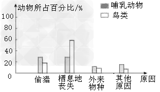 下图是一个对比哺乳动物和鸟类多样性受威胁原因的条形图 据图分析,鸟类多样性受威胁的主要原因是 下图是一个对比哺乳动物和鸟类多样性受威胁原因的条形图。据图分析,鸟类多样性受威胁的主要原因是 。哺乳动物受威胁的主要原因是 。 点击展开 匿名用户 2014-10-29 17:29 满意回答 栖息地丧失; ;偷猎和栖息地丧失 迟幼霜_Ol0N 2014-10-29 17:55 宝宝知道提示您:回答为网友贡献,仅供参考。 相关问题 一项研究显示了哺乳动物和鸟类濒危或受威胁的原因,根据下表回答问题 (1)请画出对比哺乳动 如图表示造成哺乳动物和鸟类濒危和受威胁的多种原因,其中最主要的是( )A.牺息地丧失B.偷猎C.外 一项研究显示了哺乳动物和鸟类频危或受威胁的原因 根据下表回答问题