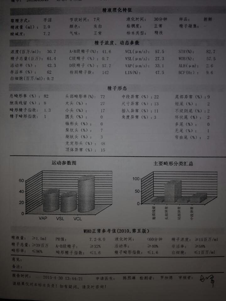 想做试管婴儿,前几天检查了精子,报告出来了,医生也没说什么 不知道有没有问题,今年36了 想做试管婴儿,前几天检查了精子,报告出来了,医生也没说什么。不知道有没有问题,今年36了。 点击展开 sdnywcn 2015-07-03 21:06 为您推荐: 其他回答 你这种情况,做试管婴儿是可以的! 6270168 2015-07-04 16:11 不正常,首先精子成活率低,活动力差,应该详细检查一下原因。这种情况是不容易怀孕的。 6270168 2015-07-03 21:37 放宽心没事的 活的精致 2015-07-03 21:14 相关问题 医生你好 我想问下我老公去检查说没精子得做试管婴儿,试 试管婴儿如果精子问题,如何 做试管婴儿精子低影响生男生女吗
