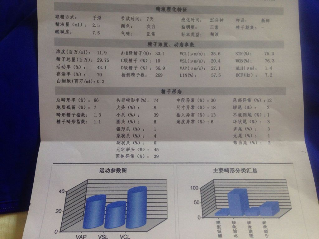 我老公做了精子质量分析报告 麻烦帮我看看这个结果可以正常怀孕吗 谢谢 点击展开 母婴用户596676837 2016-03-03 22:24 满意回答 您好从检查结果来看悠裁悠,需要考虑精降蛇子质量不好弱精少精。建议需要选录殖择中药调理治疗。 詹又松_yvIT 2016-03-03 22:46 宝宝知道提示您:回答为网友贡献,仅供参考。 相关问题 精子质量分析报告麻烦帮我分析一下 精子质量达到多少?才容易怀孕 同房后,把屁股垫高,精子还是流出来点,影响怀孕吗?是不是精子质量有问题…